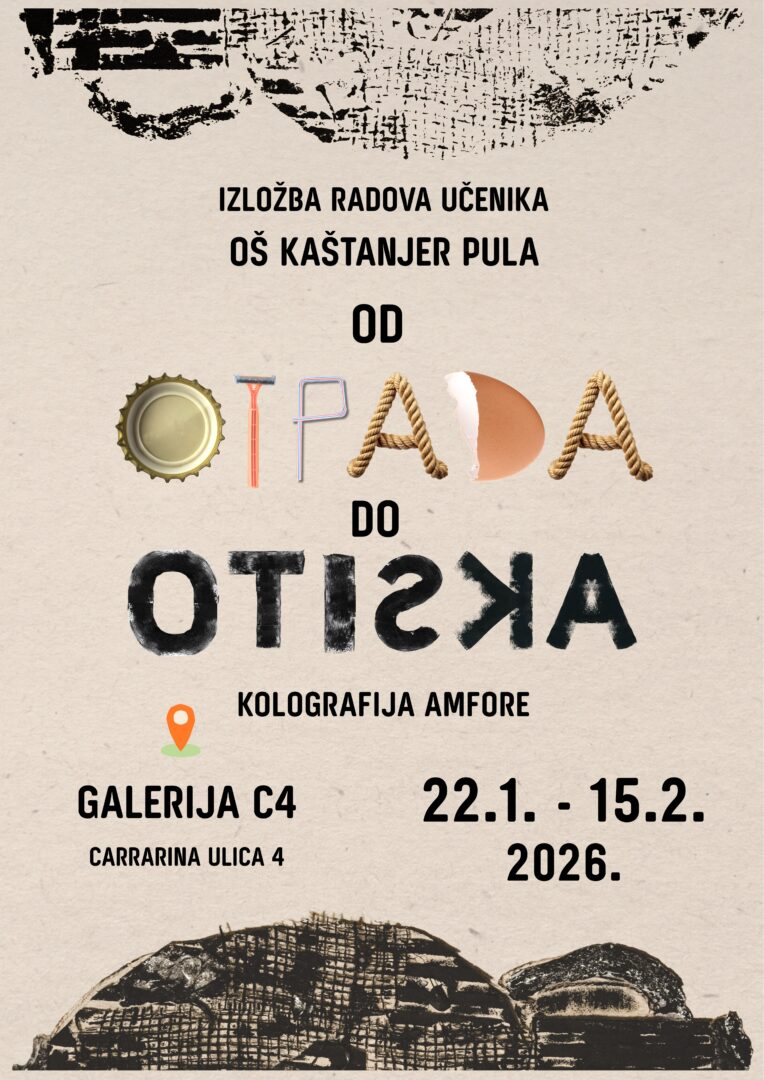 Osnovna škola Kaštanjer Pula poziva učenike, roditelje i sve zainteresirane na izložbu radova „Od otpada do otiska – kolografija amfore“, koja će se održati u Galeriji C4 (Carrarina ulica 4) od 22. siječnja do 15. veljače 2026. godine.
